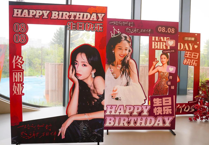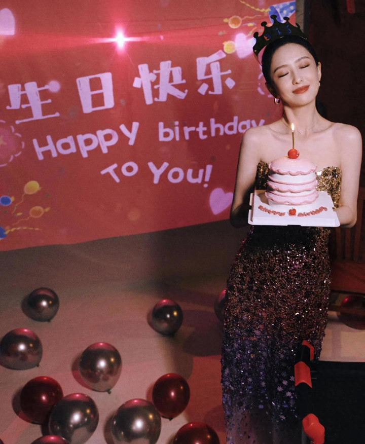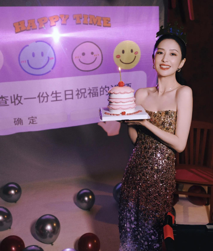 佟丽娅42岁生日派对, 身穿金色抹胸裙, 手捧蛋糕, 美到认不出