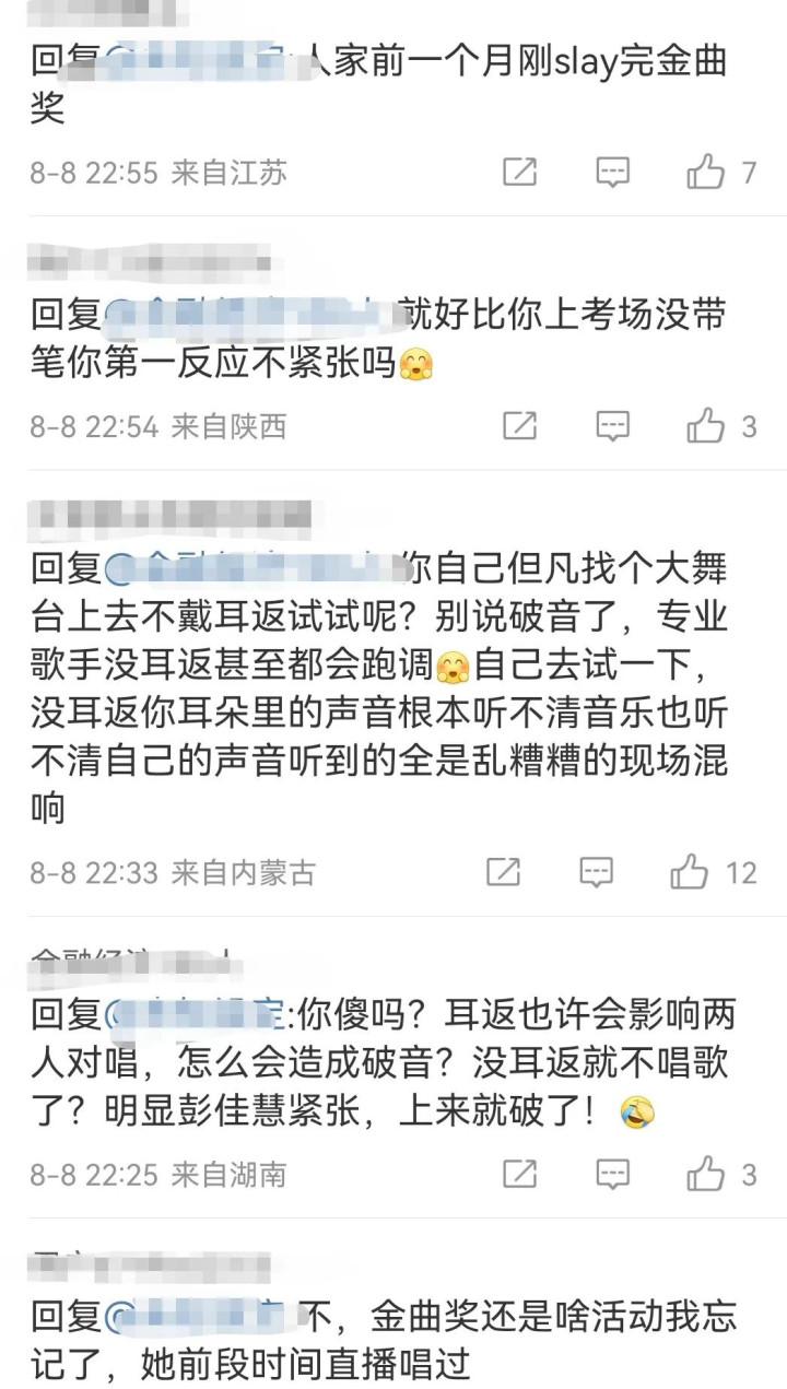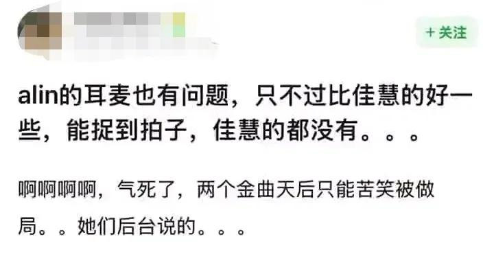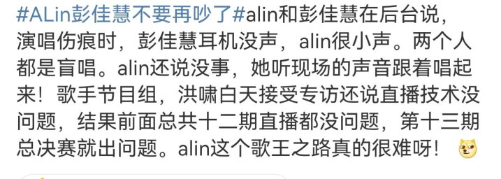 这次在帮唱环节居然破音了,演唱时彭佳慧有明显的捂住耳朵的动作,原来那个时候知道耳返有故障了。而在总决赛前,节目组导演接受采访时候还表示节目直播的技术没问题,前面十二期都没出过问题,结果却在最重要的总决赛出现故障,难怪有人感慨“Alin被做局了”,歌王之路真的很难呀!