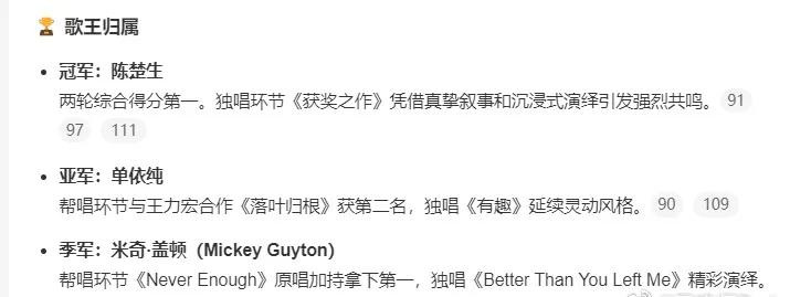 8月8日晚上,《歌手2025》终于迎来总决赛,而陈楚生最终获得冠军,成为歌王!单依纯获得亚军,米奇盖顿获得季军。