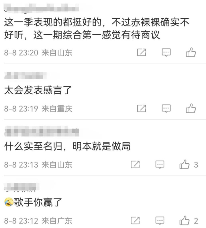 有人评价“这一季表现的都挺好的,不过赤裸裸确实不好听,这一期综合第一有待商榷。”