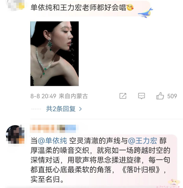 单依纯的帮唱歌手是王力宏,两人合作歌曲《落叶归根》,众多网友认为两人发挥很好,尤其是王力宏,一直在稳稳带着单依纯的声音,算是良性互动吧。