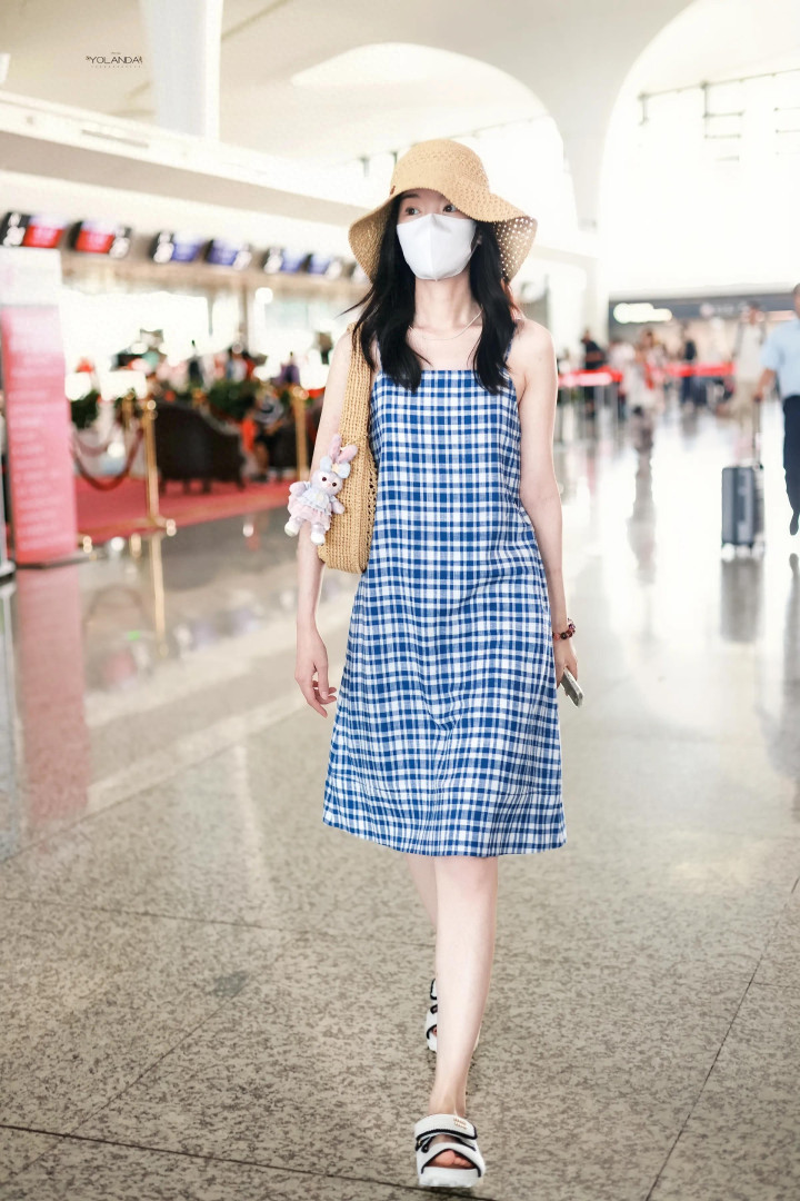 毛晓彤身穿一件蓝白格纹吊带裙,小格子复古时尚!搭配米色编织宽檐帽,和长发搭配,女神降临!脖子上佩戴了小米珠项链,气质好绝!肩上搭配编织单肩包,佩戴的可爱挂件童趣满满!