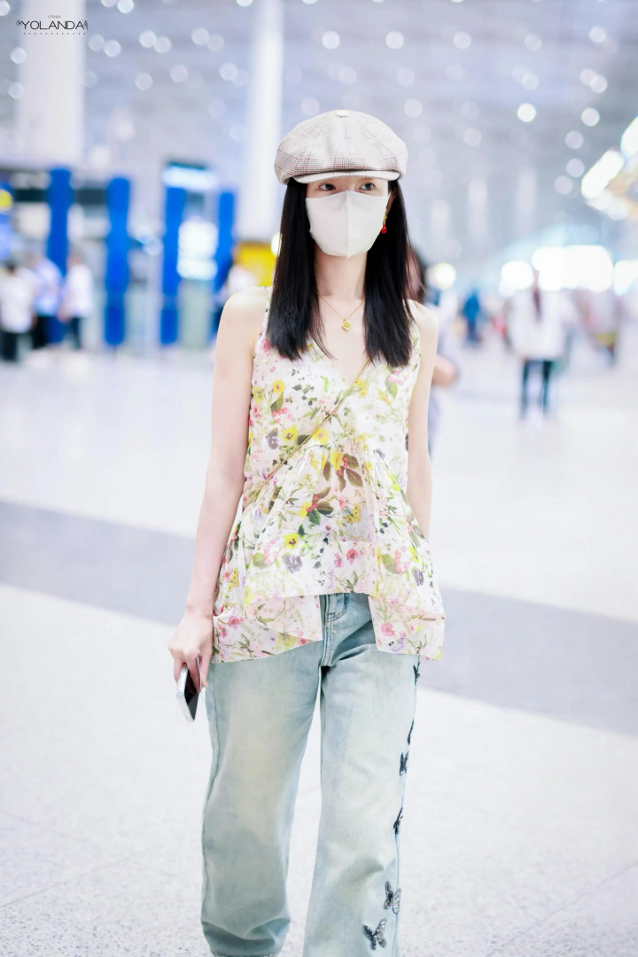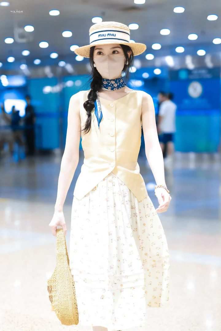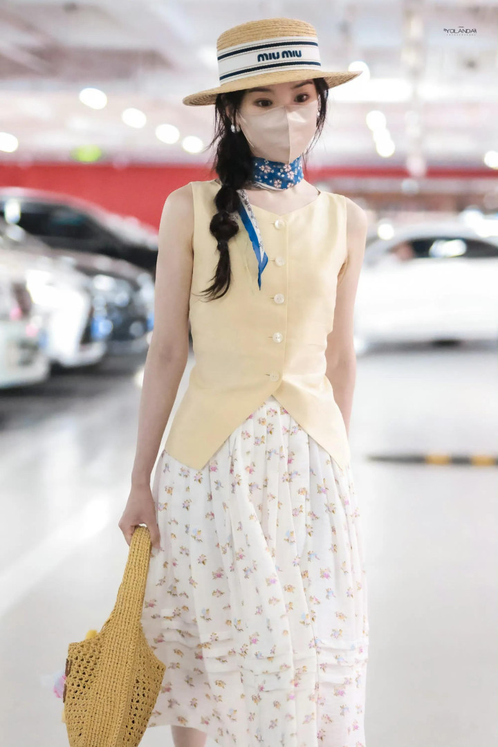 这套造型将法式优雅与少女甜美完美融合,让人眼前一亮。毛晓彤身穿的黄色无袖马甲背心色彩明亮温暖,如同夏日里的小太阳,瞬间点亮整体造型。内搭的白底碎花半身裙浪漫清新,细碎的碎花图案充满法式风情,裙摆的长度恰到好处地落在膝盖上方,露出纤细的小腿,让小个子也能穿出优雅比例。