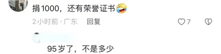 网友说才捐1000块就上电视台,还以为是捐了1000万呢!也有网友说多少都是人家的心意,95岁了,又没有工作,这是老人家在自己的养老金拿出来的钱,已经算是很不错的了。