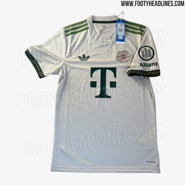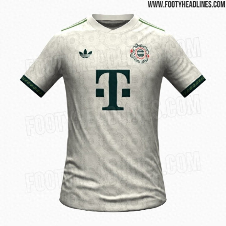 拜仁慕尼黑2025-26赛季啤酒节球衣由阿迪达斯制造,以浅米色为主色调,搭配深浅两种绿色营造独特视觉体验。