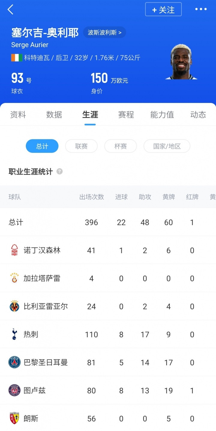 32岁的科特迪瓦右后卫奥利耶,生涯曾效力朗斯、图卢兹、巴黎、热刺、比利亚雷亚尔、诺丁汉森林和加拉塔萨雷,2025年7月,失业1年的奥利耶自由身加盟波斯波利斯。