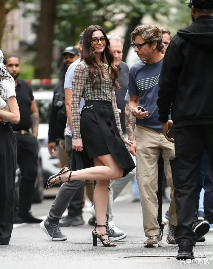 当天,安妮·海瑟薇正在纽约拍摄《穿普拉达的女王2》的街头戏份。她身着格纹上衣搭配黑色短裙,手拿面包,一身职业造型相当干练。
