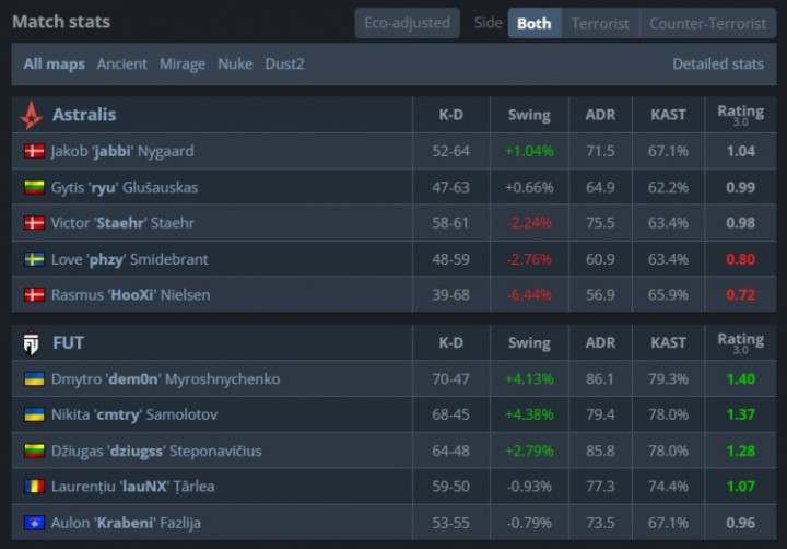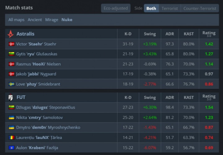 图三A队选图Nuke作T先攻,开场手枪局A队两度打A失手,dziugss两回合爆轰六杀。A队在ryu与phzy的发挥下打A得手拿到3分。尽管野榜哥Staehr后续开始发力,但FUT依然在lauNX与cmtry的发挥下将比分扩大至6-3。第10回合ryu三杀进B下包为A队拿到第4分。最终FUT以8-4结束上半场。
