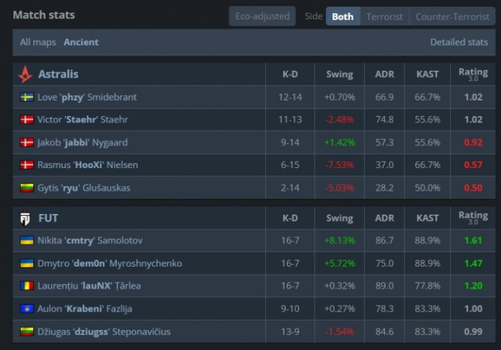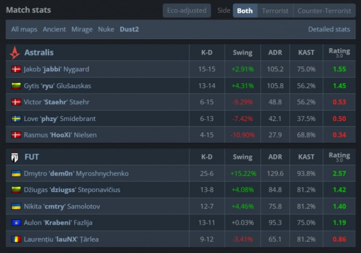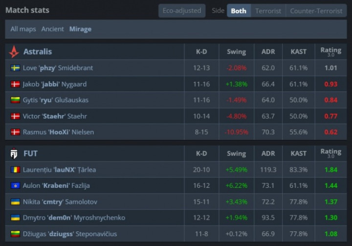 A队枪法完全不是FUT对手,cmtry第7回合大狙三杀收尾拿到第7分。第8回合ryu顶住压力跳台扫转打掉dziugss,单局三杀帮助A队拿到首分。紧接着dem0n与lauNX各取双杀拿到第8分。随后FUT再赢3v5残局,lauNX战绩来到15-3。