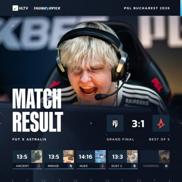 图四FUT选图Dust2作T先攻,FUT再次以5-0开局,Krabeni长枪局1v4爆轰四杀。FUT依旧枪法碾压A队,以9-3结束上半场。易边再战,A队束手就擒连送4分,FUT以13-3轻松赢下图四,大比分3-1战胜A队,勇夺PGL布加勒斯特冠军!