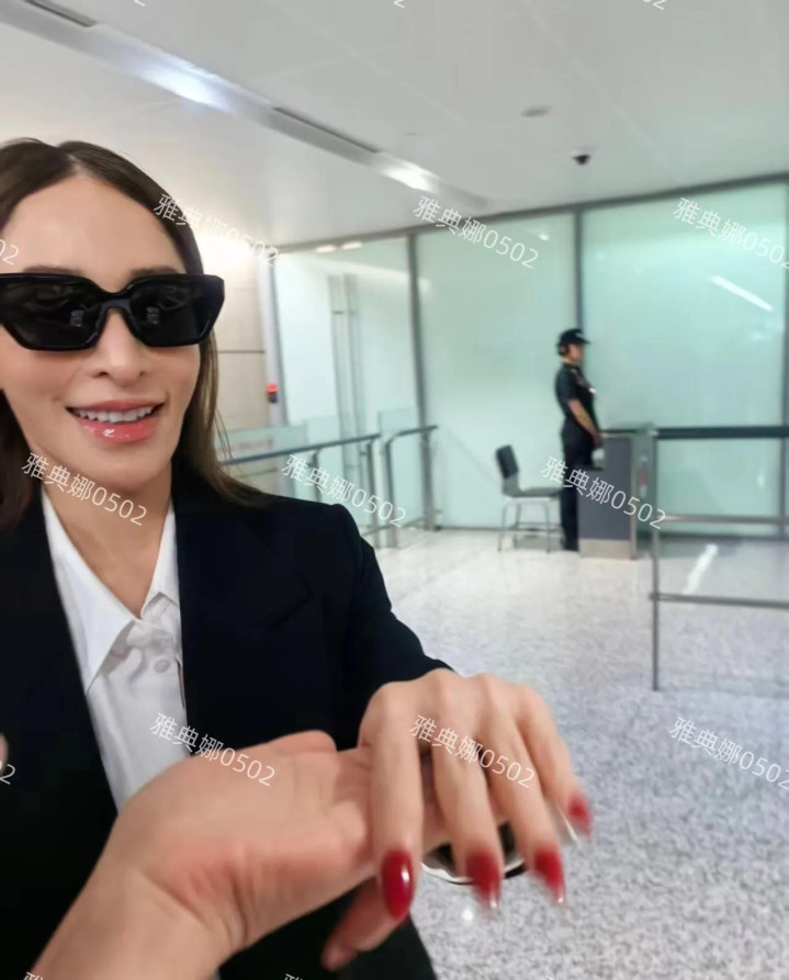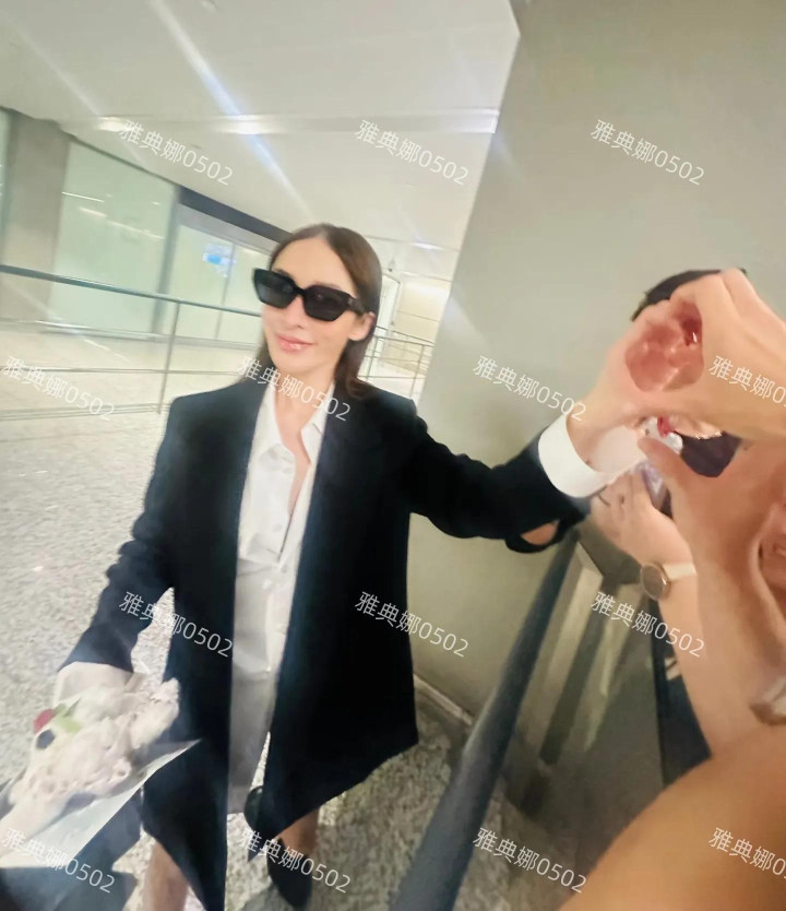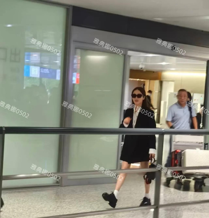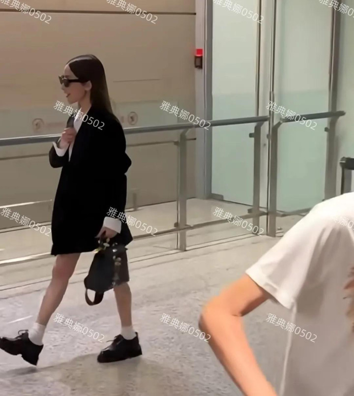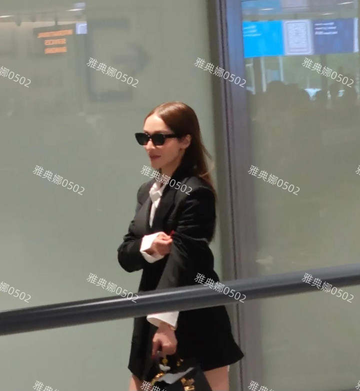 一身黑色西装戴着黑超墨镜,长发飘飘很干练气场还在明星范儿十足。