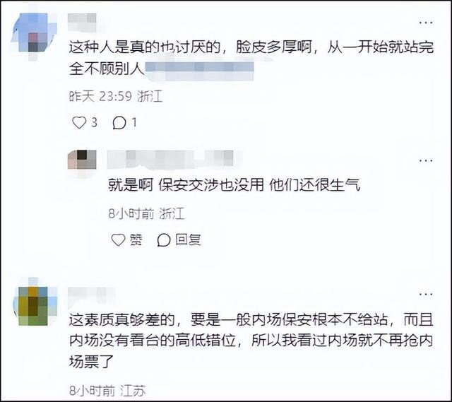 不过,也有网友说:“内场就应该站票,到了《VIVA》还坐如钟同样无语。”“所以我有时候宁可买看台(据说这次大莲花谢霆锋内场特别难抢)。”“内场买不到前排真的很容易不幸。”