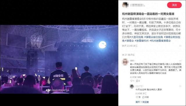 昨晚,有网友发帖问:杭州谢霆锋演唱会一直站着的一对男女是谁?