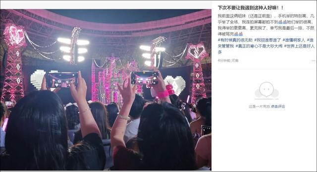 在社交平台上,不少网友都晒过看各种演出时,碰到被别人挡住视线的情况,有些人总是站起来,有些人长时间举着手机或相机。“不是所有人都想又蹦又跳,也有人想安安静静地看完全场,而且看台越往后越高怎么蹦?空间又小,想蹦去音乐节啊,不然演唱会安座椅是当饭吃的?”