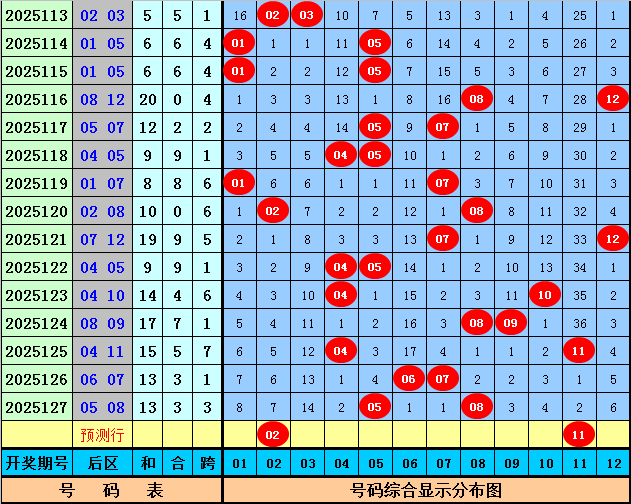 后区分析:在第128期历史同期开奖中,和值大小为8:9,跨度奇偶比为12:5,本期后区注意两码02和11。