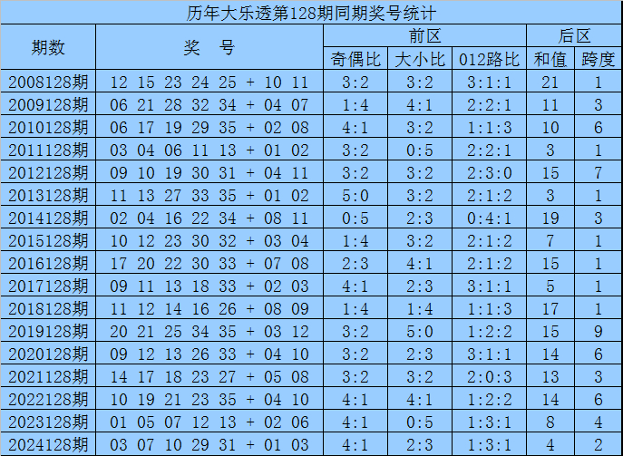 袁军师体彩大乐透第2025128期历史同期奖号分析: