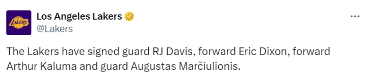 北京时间7月27日,洛杉矶湖人官方宣布,球队已签下后卫RJ-戴维斯、前锋埃里克-迪克森、前锋阿瑟-卡卢马和后卫奥古斯塔斯-马尔丘利奥尼斯。据ESPN的戴夫-麦克梅纳明报道,这四名球员均获得了Exhibit10合同。Exhibit10合同是训练营非保障合同,但如果球员被裁后能在球队的G联盟附属球队效力至少60天,就有资格获得高达85300美元的奖金。