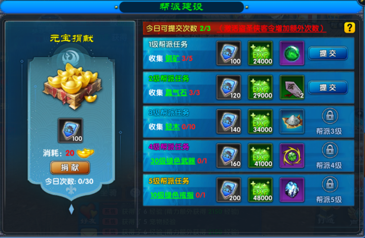 加入帮派的成员可通过任务积攒建设度,或捐献元宝加速发展 (一日三次提交任务次数,盗圣侠客令额外增加次
