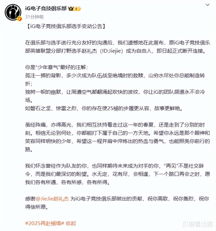 IG具体的官宣原文如下,表示和选手友好沟通后,原打野jiejie成为自由人,正式断开连接!随后IG回顾了jiejie加入后的短暂旅途,认可他能在队伍绝境时救赎,也能让队伍氛围变好,最后表示会怀念曾经作为队友的jiejie,也会期待未来作为对手的jiejie,感谢为战队做出的贡献,希望未来得偿所愿。
