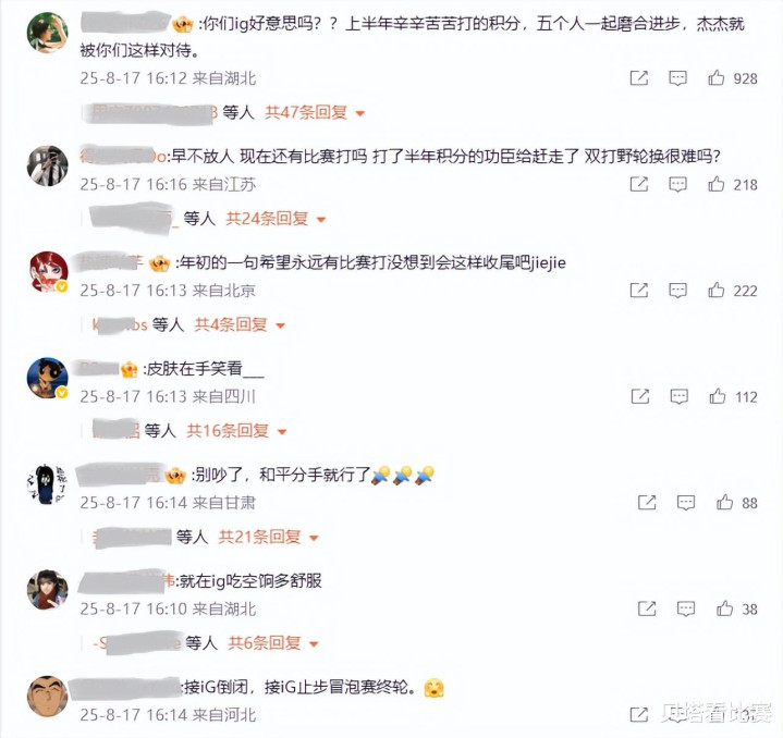 虽然辞藻很华丽,但是评论区不少粉丝非常生气。有粉丝怒斥:jiejie上半年辛辛苦苦给IG打下来的积分,结果被这样对待,为什么不能双打野轮换?多一套战术不好吗?也有粉丝表示:希望IG倒闭,希望IG进不了世界赛!当然还有粉丝认为:和平分手也是好事,没必要因为这个争吵。