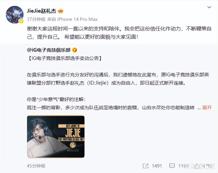 最后jiejie本人也转发了IG官博的官宣原文,表示感谢大家的支持和陪伴,自己会不断提升,希望可以以更好的面貌见面。