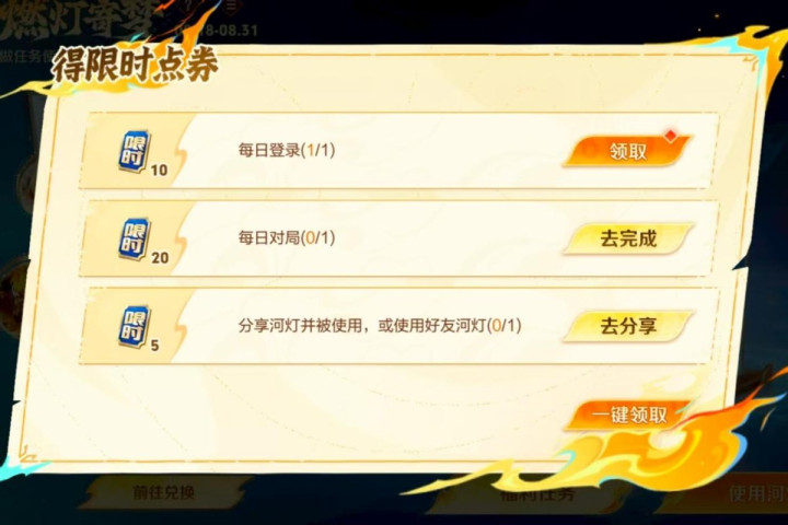 然后,会有活动任务,每日登录可获得10限时点券,相当于共计最多可获得140限时点券;每日对局可获得20限时点券,相当于最多可获得280限时点券;分享/使用河灯一次,可得5限时点券。