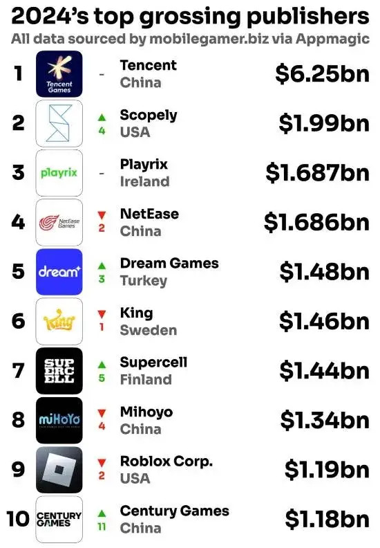 从收益回报角度来看,腾讯已成为全球最赚钱的游戏公司。根据移动应用市场研究机构AppMagic发布的《2024年的全球手游收入榜》,腾讯以62.5亿美元游戏收入实现断崖式领先,旗下共有四款游戏登上收入排行榜前十,《王者荣耀》则毫无悬念地登顶榜首。