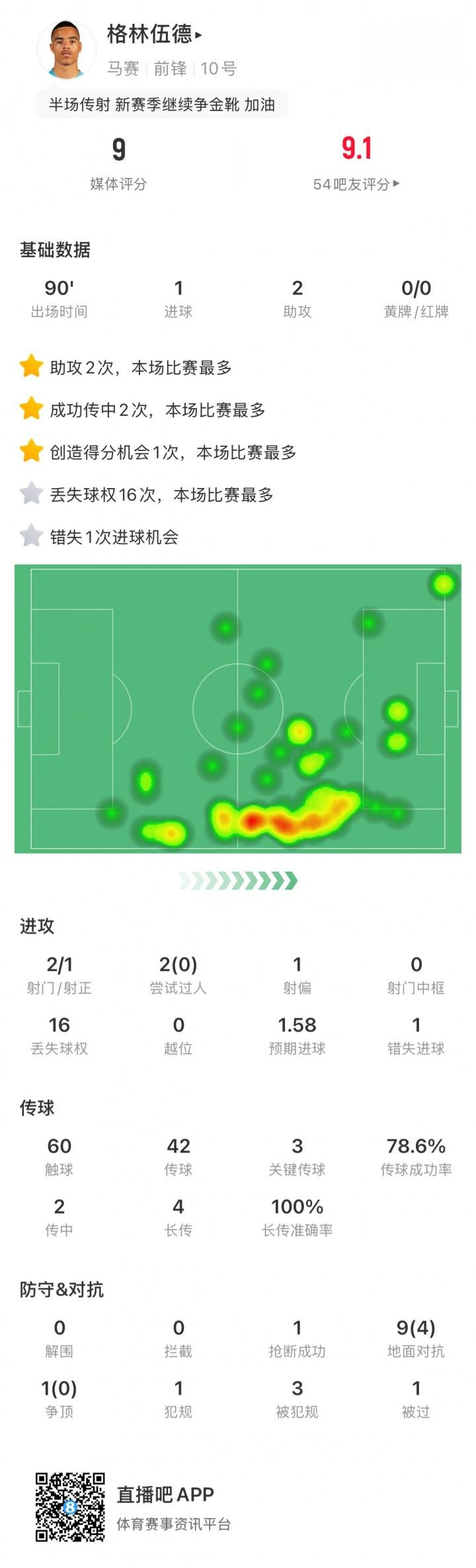 下半场补时第6分钟,格林伍德再送助攻,瓦斯破门。格林伍德本场1射2传独造3球。上赛季格林伍德代表马赛各项赛事出场36次,打进22球并送出6次助攻。