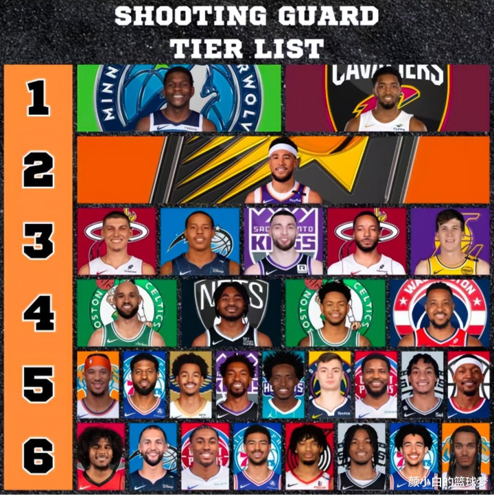 北京时间9月3日,美媒NBA.ninja为现役的得分后卫进行了分档,这与此前HoopsHype评选的25-26赛季前26得分后卫有所不同,因为分档有些球员就是并列的关系。